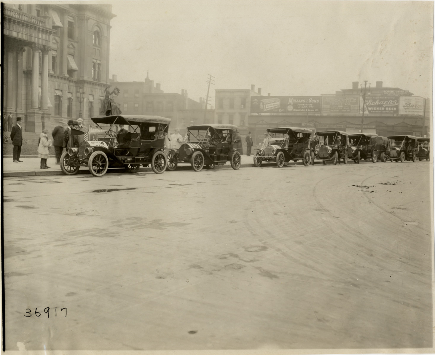 View of cars lined up in front of city hall at Philadelphia, Pennsylvania during the 1910 New York to Atlanta Good Roads Tour. Stamped on back: "Spooner & Wells, Inc., photographers, telephones 3472-3473 Columbus, 1931 Broadway, New York." Handwritten on back: "Tours--New York-Atlanta Good Roads Tour, 1910."