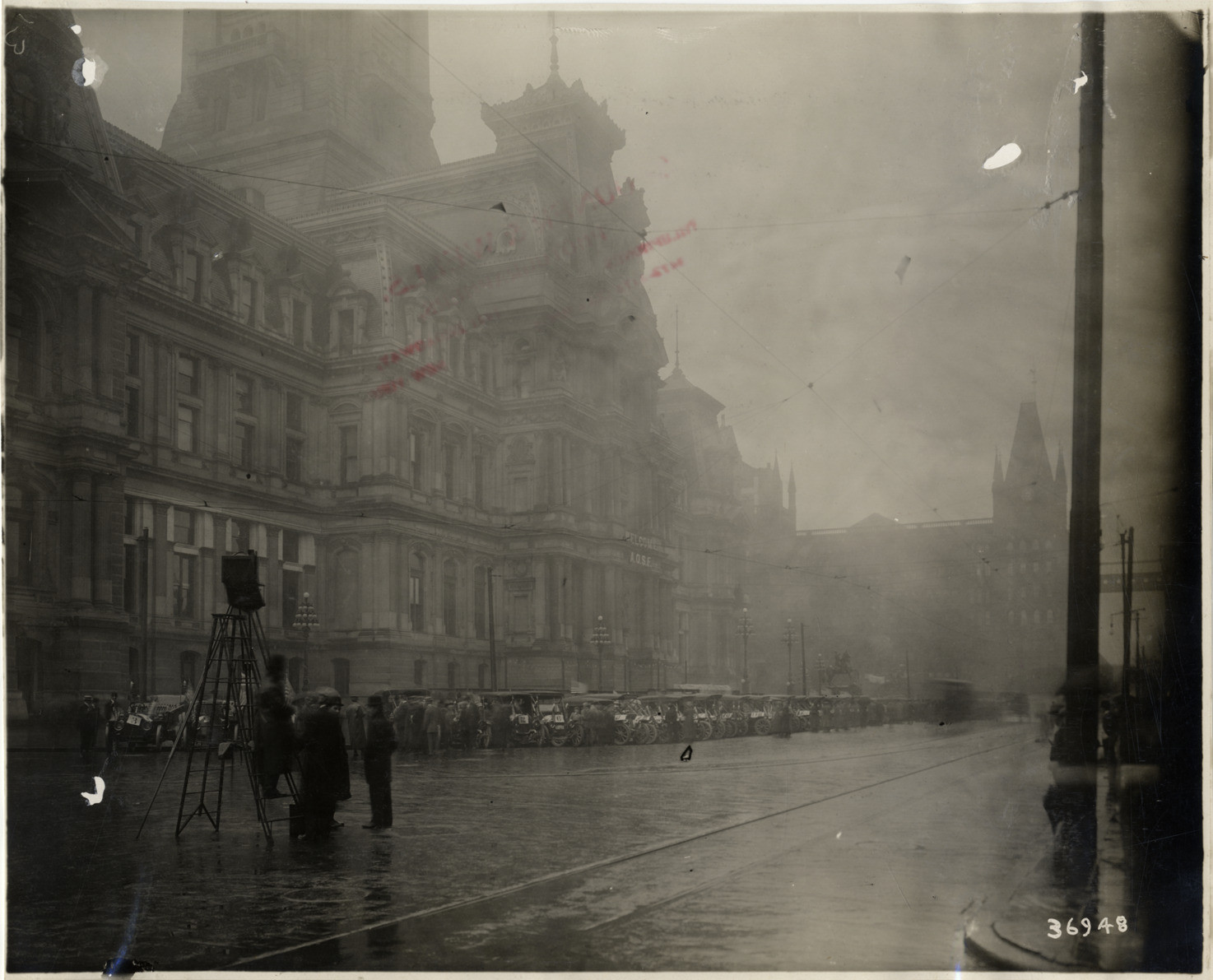 Automobiles lined up in front of Philadelphia City Hall, 1910 New York-Atlanta Good Roads Tour
