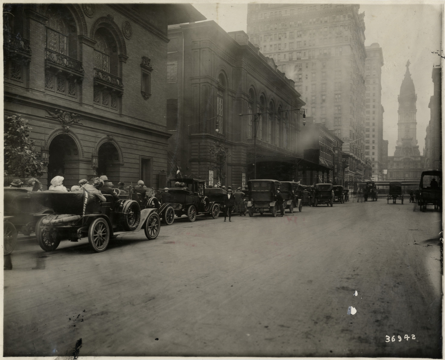 Rear view of motorists with cars lined up in front of Philadelphia Opera House at Philadelphia, Pennsylvania during the 1910 New York to Atlanta Good Roads Tour. Stamped on back: "Spooner & Wells, Inc., photographers, telephones 3472-3473 Columbus, 1931 Broadway, New York." Handwritten on back: "Phila. Tours--New York-Atlanta Good Roads Tour, 1910."