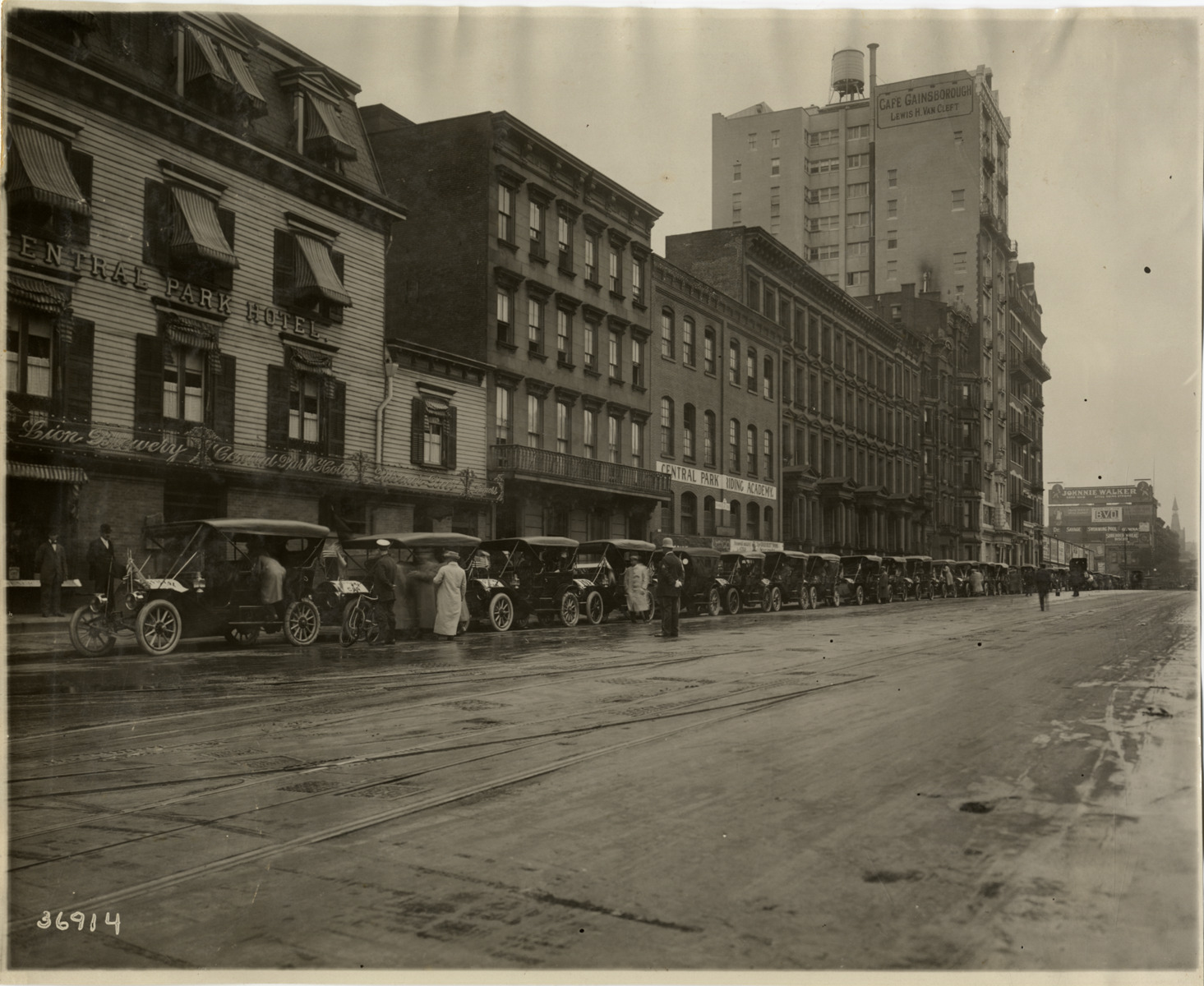 View of cars lined up in street at New York, New York during the 1910 New York to Atlanta Good Roads Tour. Central Park Hotel, Central Park Riding Academy and other commercial buildings on street. Handwritten on back: "Tours--New York-Atlanta Good Roads Tour, 1910."