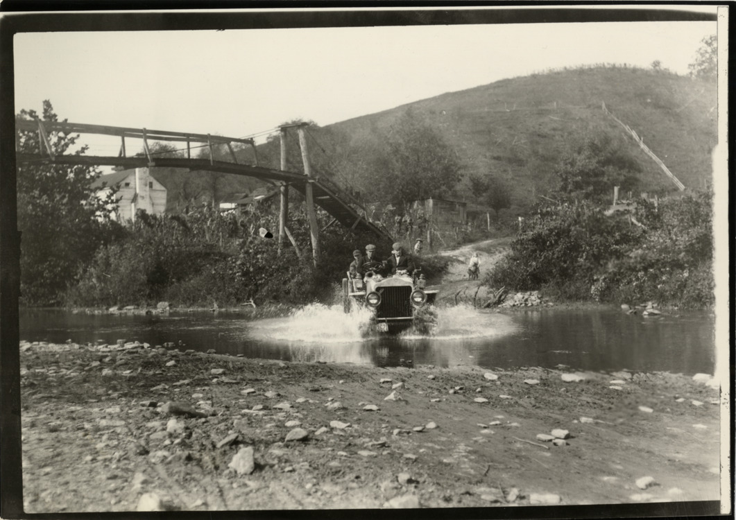 View of motorists in White steamer fording river or stream during the 1910 New York to Atlanta Good Roads Tour. Bridge in background. Handwritten on back: "Fording stream on '10, N.Y. Herald tour. Tours--New York-Atlanta Good Roads Tour, 1910."
