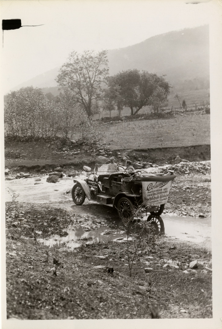 Rear view of Columbia pathfinder and inspection car traveling across riverbed during the 1910 New York to Atlanta Good Roads Tour. Sign on back of car reads: "Columbia, pathfinder and inspection car, New York Herald, Atlanta Journal, National Highway, 1910." Stamped on back: "Photographic illustration by Nick Lazarnick, 230 Park Ave., N.Y." Handwritten on back: "Columbia car enroute to Atlanta, 1910. Tours--New York-Atlanta Good Roads Tour, 1910."