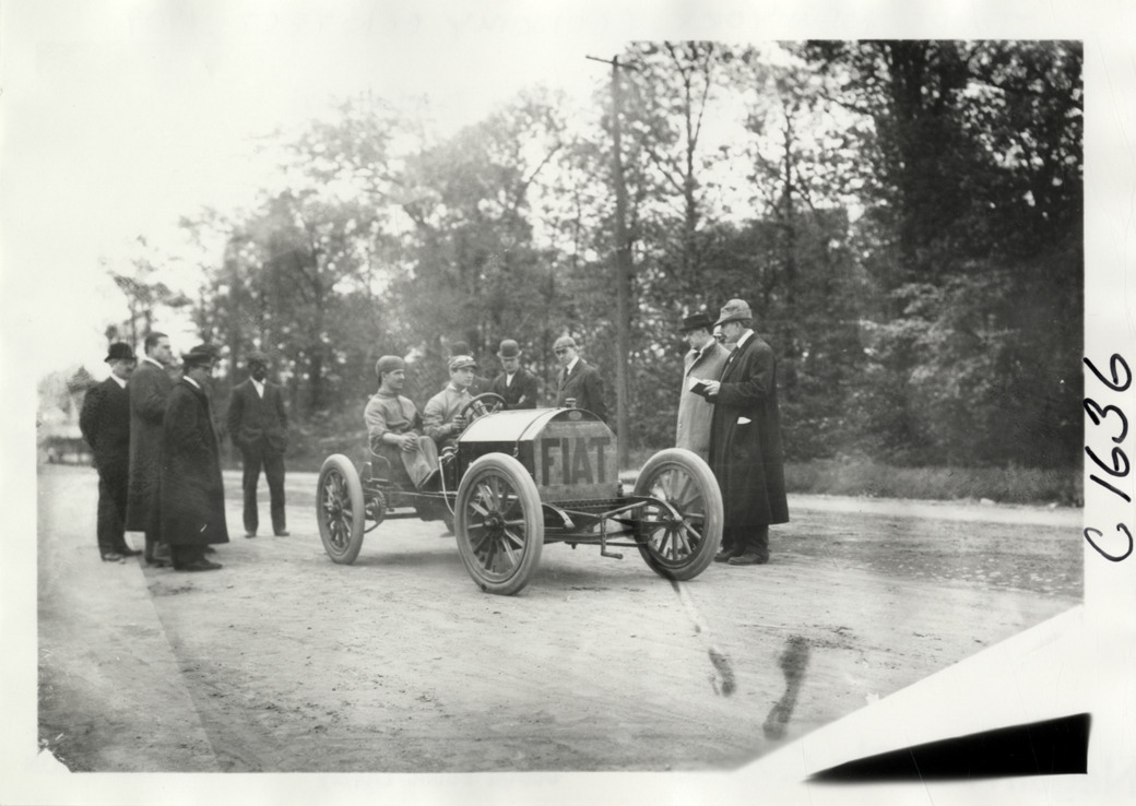 View of motorists in Fiat car, surrounded by several spectators, during the 1909 New York Economy Contest. The one-gallon efficiency contest was sponsored by the New York Automobile Trade Association as part of its second annual automobile carnival. Handwritten on back: "Fiat, driven by Ralph DePalma. Tours--New York Economy Contest, 1909."