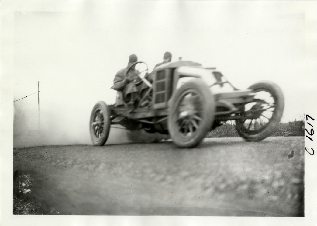 View of motorists in Renault car during the 1909 New York Economy Contest. The one-gallon efficiency contest was sponsored by the New York Automobile Trade Association as part of its second annual automobile carnival. Handwritten on back: "Tours--New York Economy Contest, 1909."