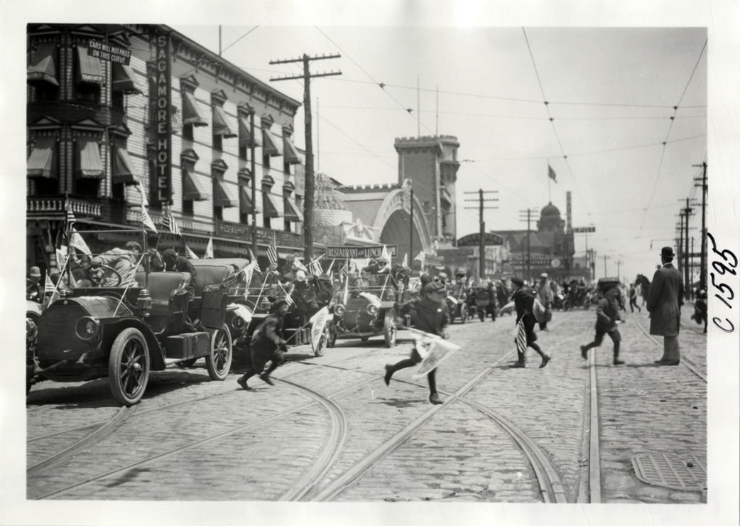 View of children running across street, holding pennants, at Coney Island, Brooklyn, New York during the 1910 annual excursion for orphans sponsored by the Orphan's Automobile Day Committee of New York. Automobiles are lined up in street. Approximately 3,000 children were taken on a trip to the Dreamland amusement park at Coney Island. Handwritten on back: "Tours--New York Orphans Day outing, 1910."