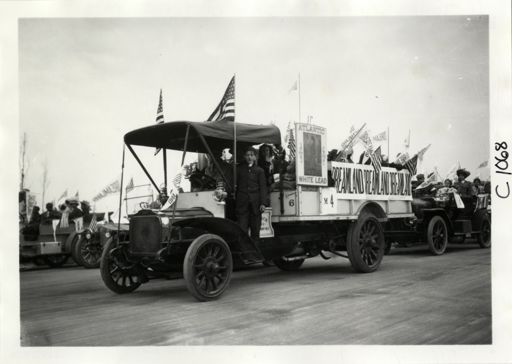 View of children in truck during the 1910 annual excursion for orphans sponsored by the Orphan's Automobile Day Committee of New York. Truck is decorated with Dreamland banner, American flags and "Atlantic White Lead" sign. Approximately 3,000 children were taken on a trip to the Dreamland amusement park at Coney Island. Handwritten on back: "Tours--New York Orphans Day outing, 1910."