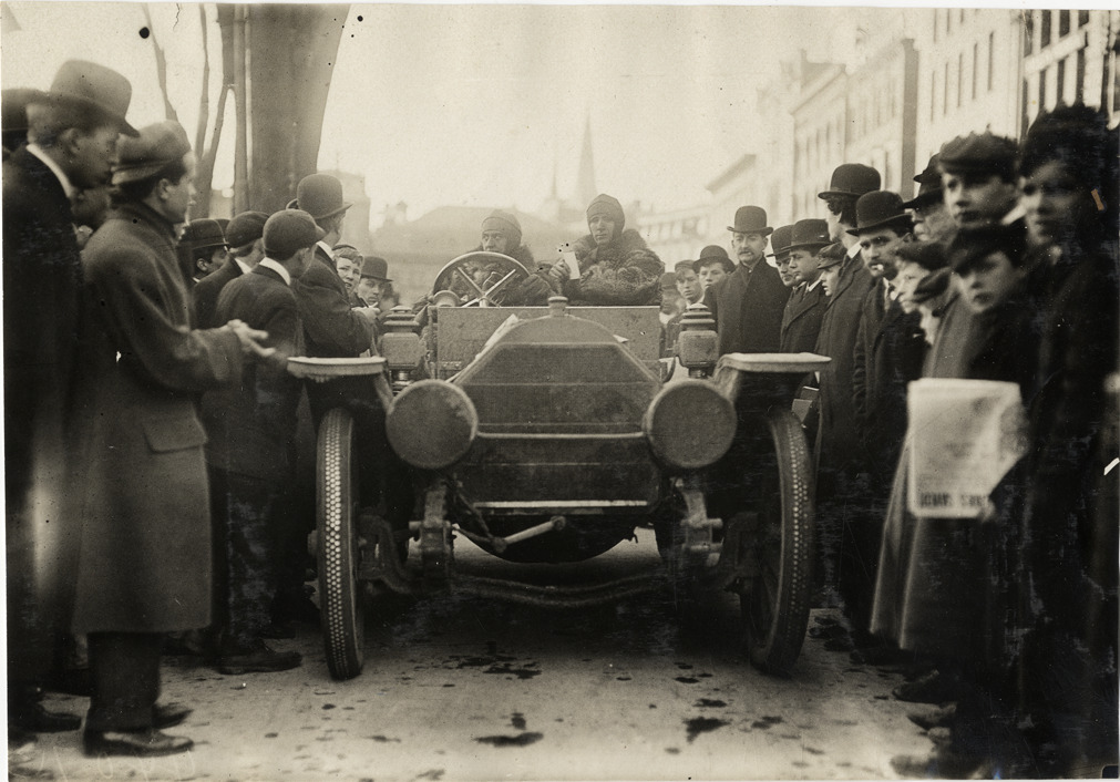 View of motorists posing in car, surrounded by spectators, during the 1909 New York to Boston endurance run. Stamped on back: "Spooner & Wells, Inc., photographers, telephones 3472-3473 Columbus, 1931 Broadway, New York." Handwritten on back: "Tours--New York to Boston Endurance Run, 1909."