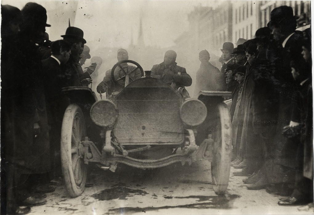 View of motorists posing in car, surrounded by spectators, during the 1909 New York to Boston endurance run. Handwritten on back: "Tours--New York to Boston Endurance Run, 1909."