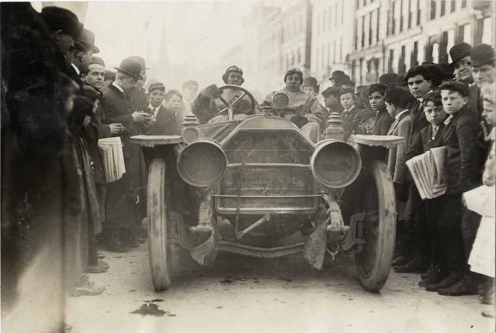View of motorists posing in car, surrounded by spectators, during the 1909 New York to Boston endurance run. Stamped on back: "Spooner & Wells, Inc., photographers, telephones 3472-3473 Columbus, 1931 Broadway, New York." Handwritten on back: "Tours--New York to Boston Endurance Run, 1909."