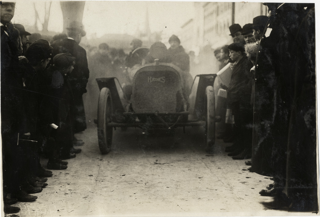 View of motorists posing in Haynes car, surrounded by spectators, during the 1909 New York to Boston endurance run. Handwritten on back: "Tours--New York to Boston Endurance Run, 1909."