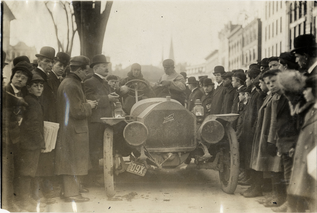 View of motorists in Knox car, surrounded by spectators, during the 1909 New York to Boston endurance run. Stamped on back: "Spooner & Wells, Inc., photographers, telephones 3472-3473 Columbus, 1931 Broadway, New York." Handwritten on back: "Tours--New York to Boston Endurance Run, 1909."