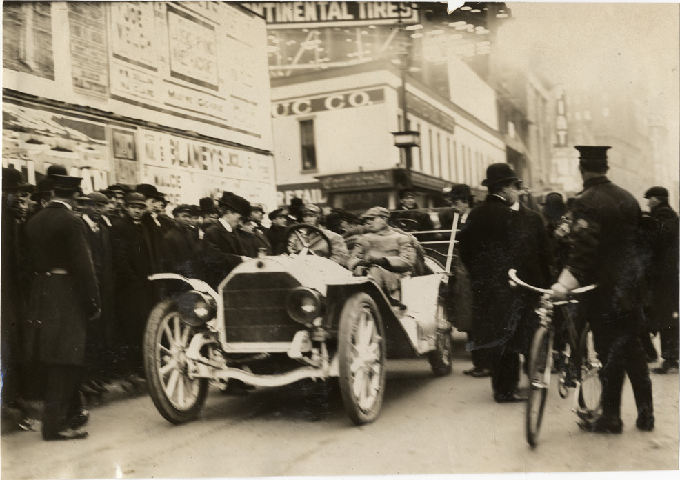 View of motorists in Premier car during the 1909 New York to Boston endurance run. Spectators stand on sidewalk; policeman with bicycle on right. Stamped on back: "Spooner & Wells, Inc., photographers, telephones 3472-3473 Columbus, 1931 Broadway, New York." Handwritten on back: "Premier. Tours--New York to Boston Endurance Run, 1909."