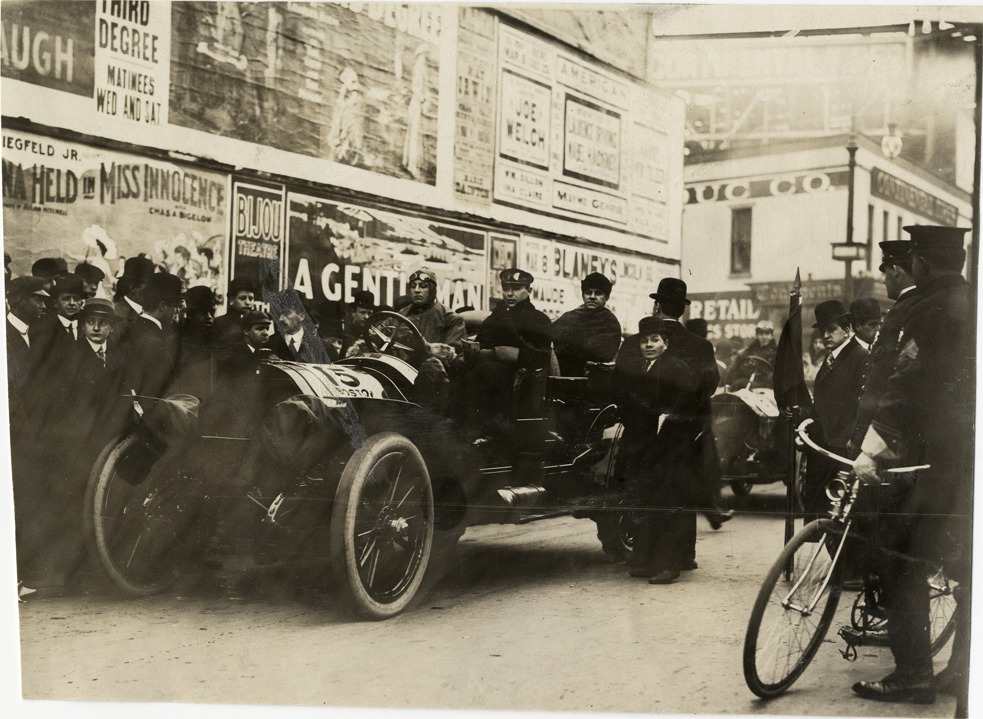 View of motorists posing in Matheson car no. 15, surrounded by spectators, during the 1909 New York to Boston endurance run. Policemen with bicycle on right; posters on wall in background. Stamped on back: "Spooner & Wells, Inc., photographers, telephones 3472-3473 Columbus, 1931 Broadway, New York." Handwritten on back: "Tours--New York to Boston Endurance Run, 1909."