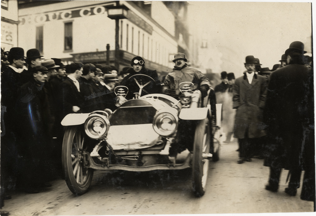Motorists posing in automobile, 1909 New York to Boston Endurance Run