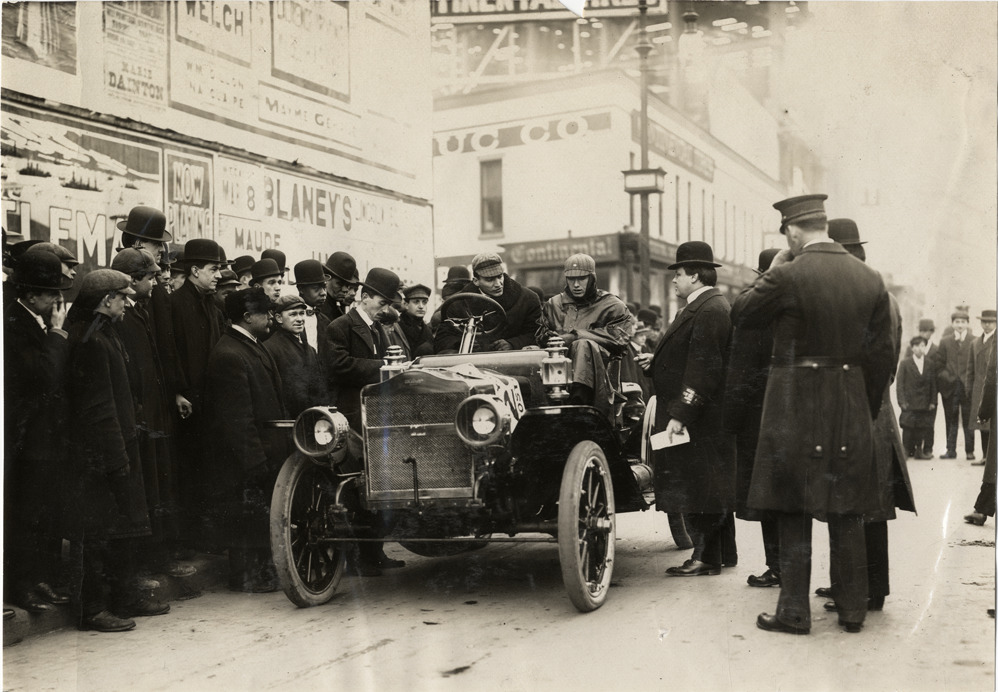 View of motorists in Maxwell car, surrounded by spectators, during the 1909 New York to Boston endurance run. Stamped on back: "Spooner & Wells, Inc., photographers, telephones 3472-3473 Columbus, 1931 Broadway, New York." Handwritten on back: "Kelsey, Maxwell. Tours--New York to Boston Endurance Run, 1909."