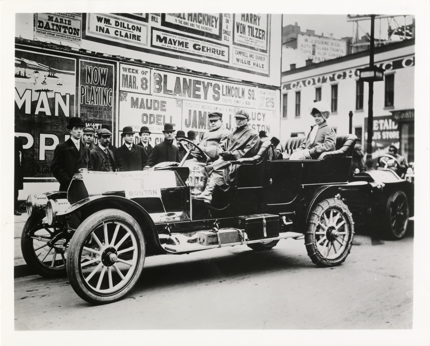 View of motorists posing in Kissel Kar no. 7 during the 1909 New York to Boston endurance run. Spectators stand on sidewalk in background. Handwritten on back: "Tours--New York to Boston Endurance Run, 1909."