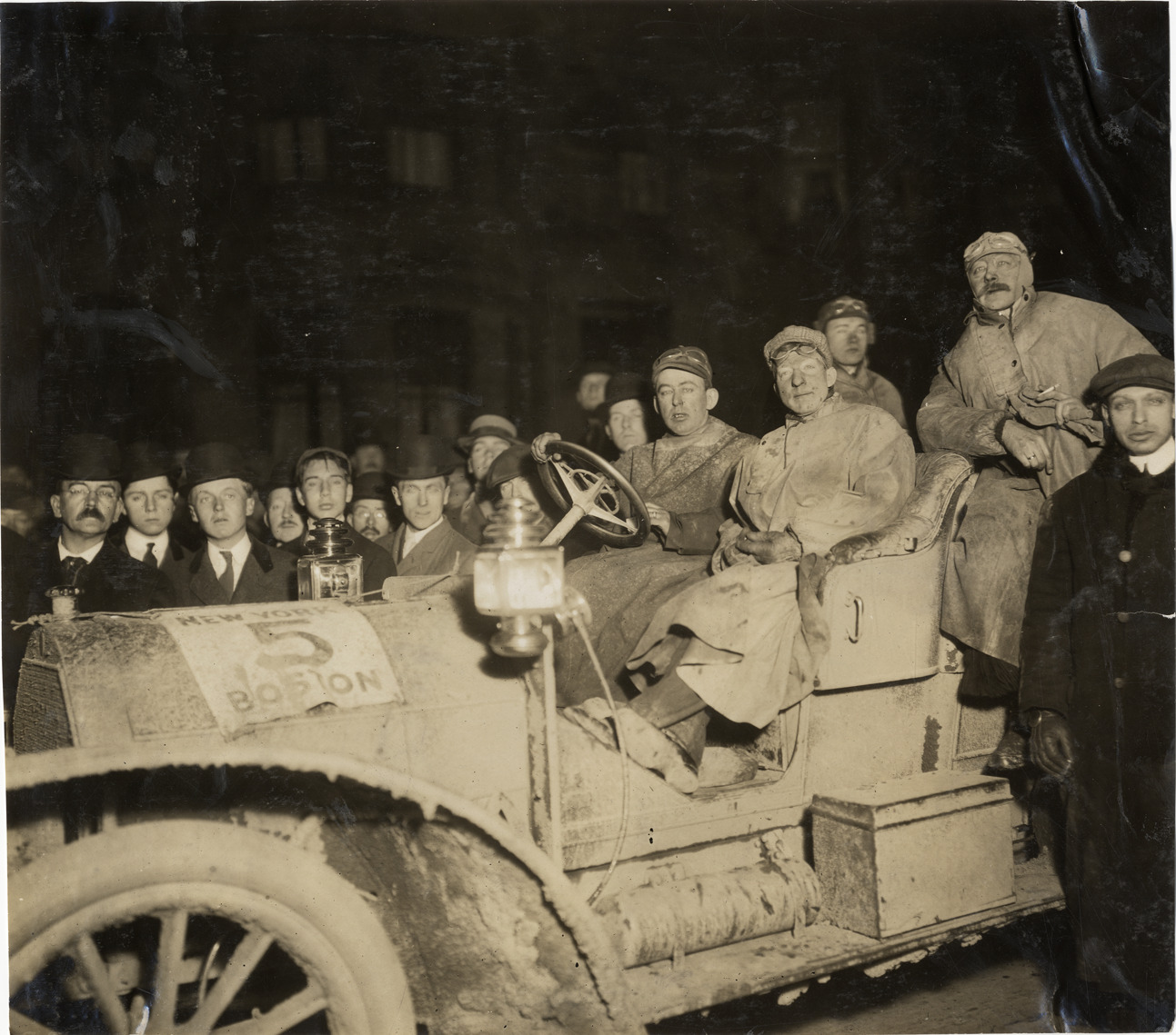 Nighttime view of A.D. Hall and motorists posing in Matheson car no. 5 during the 1909 New York to Boston endurance run. Spectators stand in background. Stamped on back: "Spooner & Wells, Inc., photographers, telephones 3472-3473 Columbus, 1931 Broadway, New York." Handwritten on back: "A.D. Hall, Matheson. Tours--New York to Boston Endurance Run, 1909."