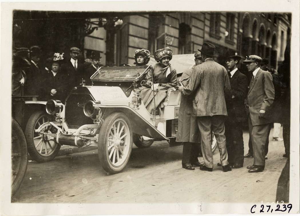 View of Blanche Stuart Scott and Gertrude or Amy Phillips in Overland car, surrounded by spectators, during the 1910 New York to San Francisco tour. The promotional cross-country tour was sponsored by the Willys-Overland Company. Stamped on back: "Spooner & Wells, Inc., photographers, telephones 3472-3473 Columbus, 1931 Broadway, New York." Handwritten on back: "Tours--New York to San Francisco, 1910."