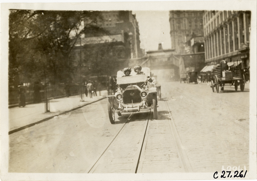 View of Blanche Stuart Scott and Gertrude or Amy Phillips in Overland car during the 1910 New York to San Francisco tour. The promotional cross-country tour was sponsored by the Willys-Overland Company. Stamped on back: "Spooner & Wells, Inc., photographers, telephones 3472-3473 Columbus, 1931 Broadway, New York." Handwritten on back: "Tours--New York to San Francisco, 1910."