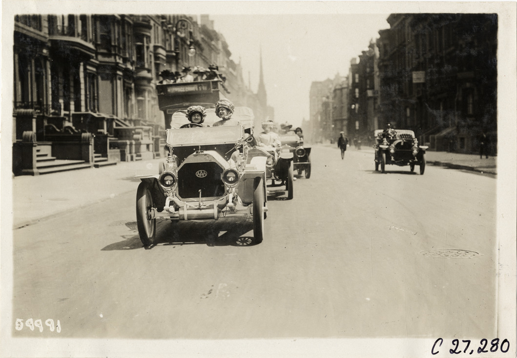 View of Blanche Stuart Scott and Gertrude or Amy Phillips in Overland car, followed by several cars, during the 1910 New York to San Francisco tour. The promotional cross-country tour was sponsored by the Willys-Overland Company. Stamped on back: "Spooner & Wells, Inc., photographers, telephones 3472-3473 Columbus, 1931 Broadway, New York." Handwritten on back: "Tours--New York to San Francisco, 1910."