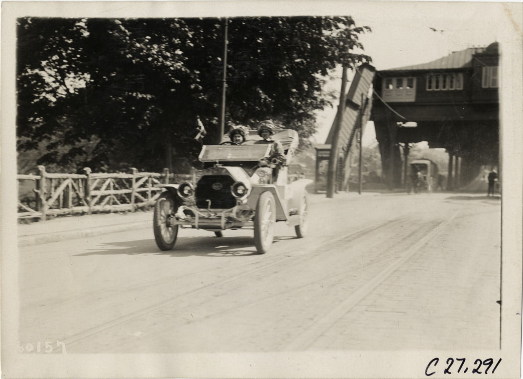 View of Blanche Stuart Scott and Gertrude or Amy Phillips in Overland car during the 1910 New York to San Francisco tour. The promotional cross-country tour was sponsored by the Willys-Overland Company. Stamped on back: "Spooner & Wells, Inc., photographers, telephones 3472-3473 Columbus, 1931 Broadway, New York." Handwritten on back: "Tours--New York to San Francisco, 1910."