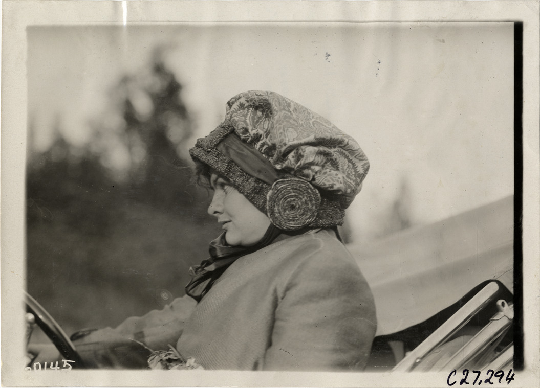 Close-up view of Blanche Stuart Scott in Overland car during the 1910 New York to San Francisco tour. The promotional cross-country tour was sponsored by the Willys-Overland Company. Stamped on back: "Spooner & Wells, Inc., photographers, telephones 3472-3473 Columbus, 1931 Broadway, New York." Handwritten on back: "Tours--New York to San Francisco, 1910."