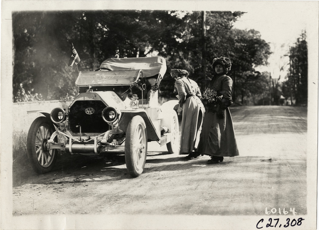View of Blanche Stuart Scott and Gertrude or Amy Phillips with Overland car on roadside during the 1910 New York to San Francisco tour. The promotional cross-country tour was sponsored by the Willys-Overland Company. Stamped on back: "Spooner & Wells, Inc., photographers, telephones 3472-3473 Columbus, 1931 Broadway, New York." Handwritten on back: "Tours--New York to San Francisco, 1910."
