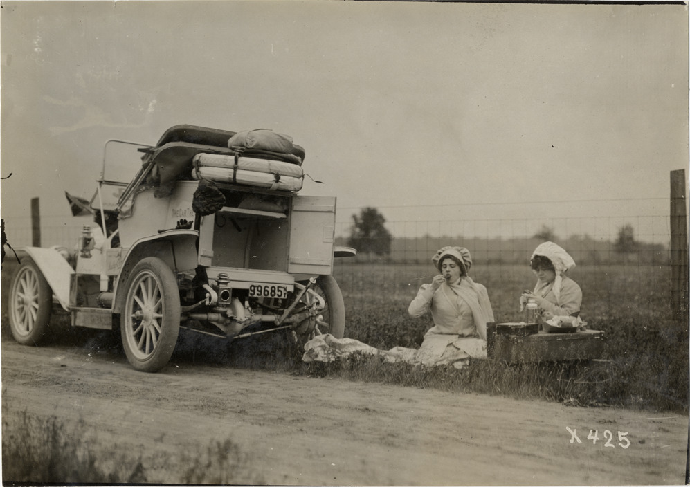 Blanche Stuart Scott and Miss Phillips eating lunch on roadside, 1910 New York to San Francisco tour