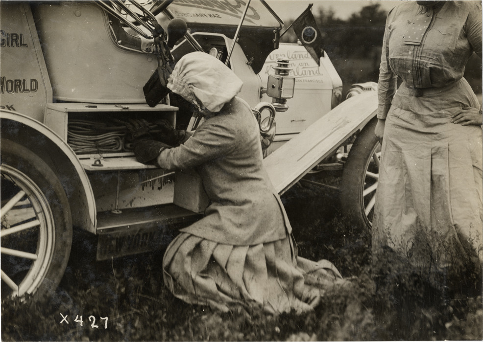 View of Blanche Stuart Scott placing automobile supplies in storage container on Overland car during the 1910 New York to San Francisco tour. Gertrude or Amy Phillips stands on right. The promotional cross-country tour was sponsored by the Willys-Overland Company. Stamped on back: "Spooner & Wells, Inc., photographers, telephone North 1745. 1231 Woodward Ave., Detroit, Mich. Detroit, 1231 Woodward, New York, 1931 Broadway." Handwritten on back: "Tours--New York to San Francisco, 1910."