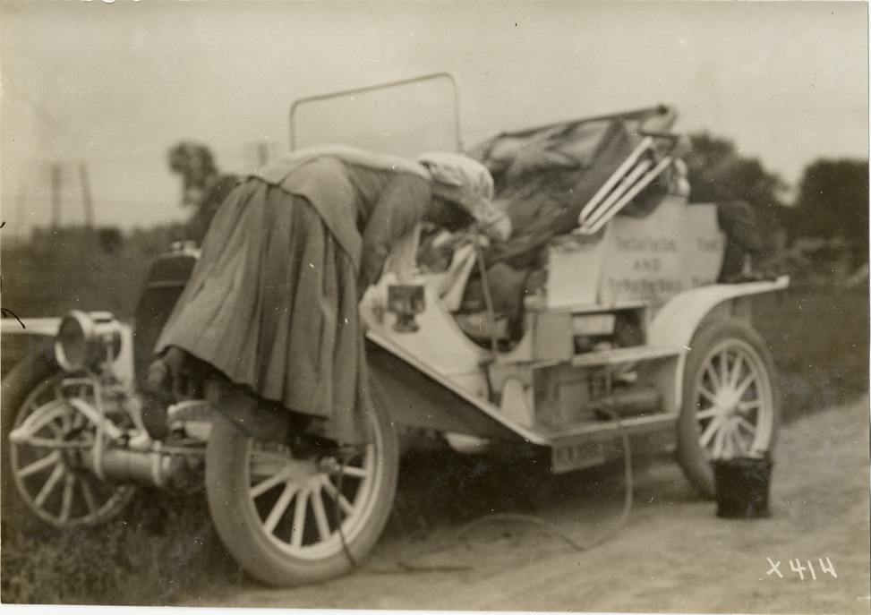 View of Blanche Stuart Scott adding air to front tire on Overland car during the 1910 New York to San Francisco tour. The promotional cross-country tour was sponsored by the Willys-Overland Company. Stamped on back: "Spooner & Wells, Inc., photographers, telephone North 1745. 1231 Woodward Ave., Detroit, Mich. Detroit, 1231 Woodward, New York, 1931 Broadway." Handwritten on back: "Tours--New York to San Francisco, 1910."