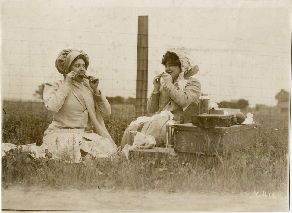 Blanche Stuart Scott and Miss Phillips eating lunch on roadside, 1910 New York to San Francisco tour