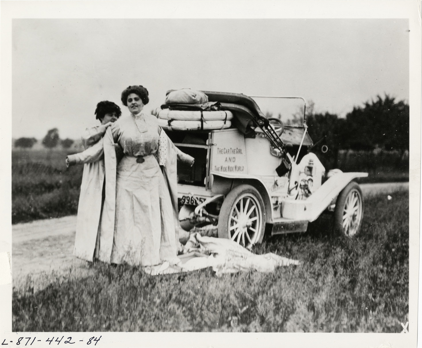 View of Blanche Stuart Scott helping Gertrude or Amy Phillips don a driving coat during the 1910 New York to San Francisco tour. Overland car on roadside. The promotional cross-country tour was sponsored by the Willys-Overland Company. Handwritten on back: "Miss Scott (rear) & Miss Phillips (front) of Overland. Tours--New York to San Francisco, 1910."