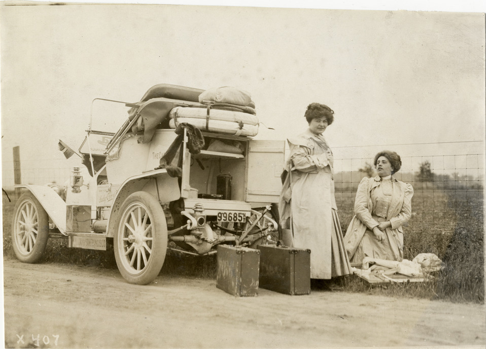 View of Blanche Stuart Scott and Gertrude or Amy Phillips with Overland car on roadside during the 1910 New York to San Francisco tour. Two suitcases are behind car. The promotional cross-country tour was sponsored by the Willys-Overland Company. Handwritten on back: "Tours--New York to San Francisco, 1910."