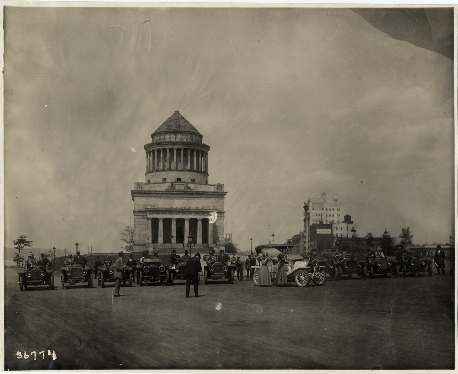 Overland automobile and other automobiles at Grant's Tomb, 1910 New York to San Francisco tour