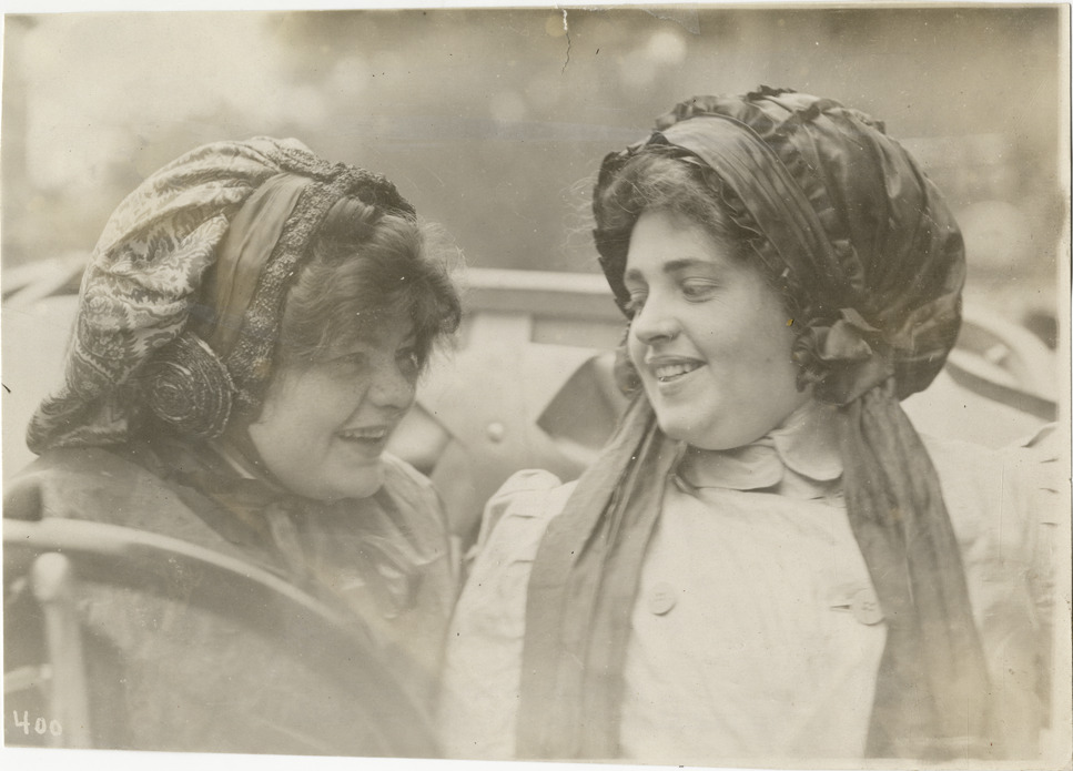 Close-up view of Blanche Stuart Scott and Gertrude or Amy Phillips during the 1910 New York to San Francisco tour. The promotional cross-country tour was sponsored by the Willys-Overland Company. Handwritten on back: "Miss Scott, Miss Phillips. Tours--New York to San Francisco, 1910."