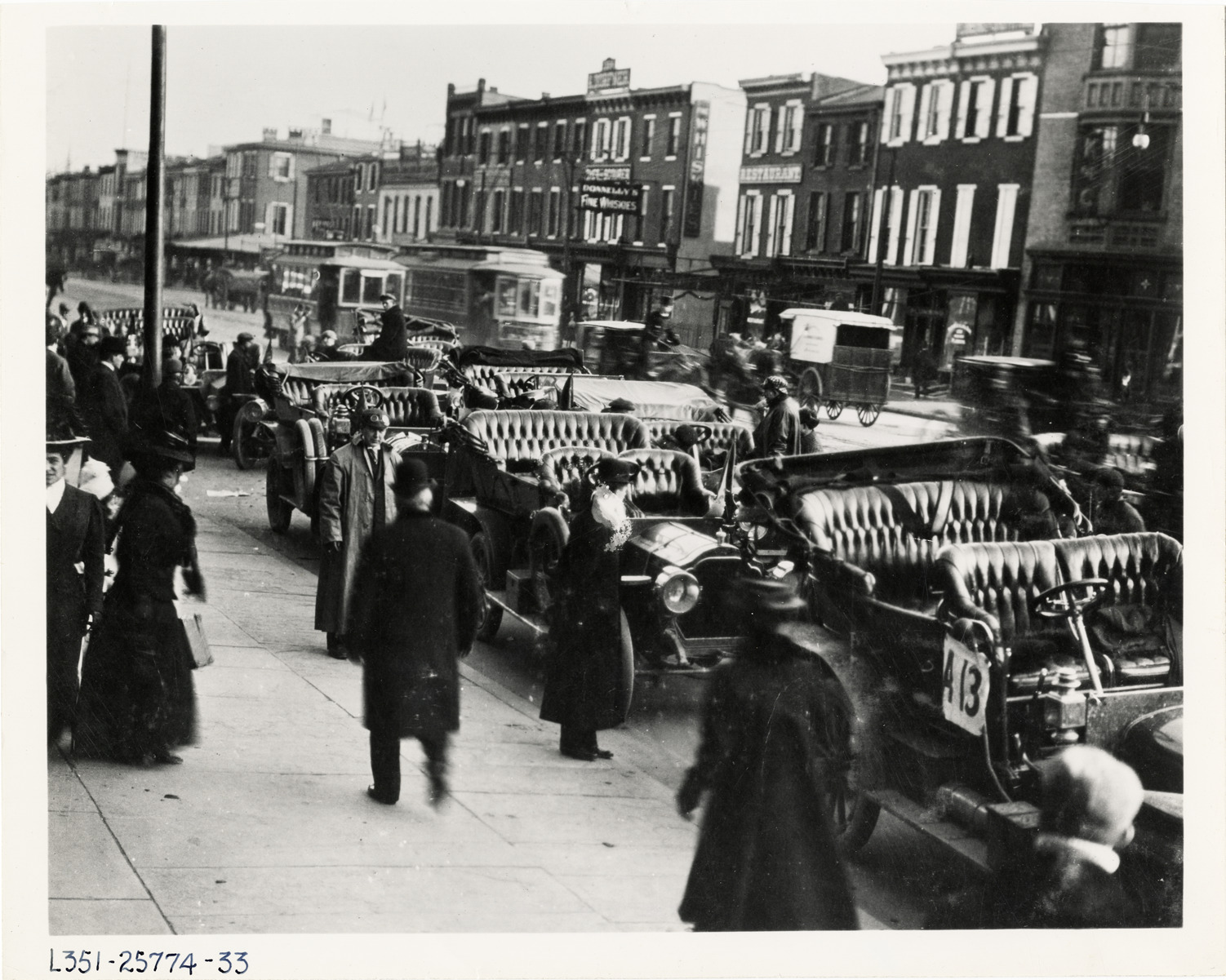 View of cars lined up in street during the 1908 Norristown, Pennsylvania endurance run. Handwritten on back: "Cars are assembled for the first Norristown (Pa.) automobile club endurance run on April 28, 1908. The route included Coatesville, Lancaster, Reading, Pottstown and Norristown, a distance of 123 miles to be covered in 7 hours and 15 minutes. Tours--Norristown (Pa.) endurance run, 1908."