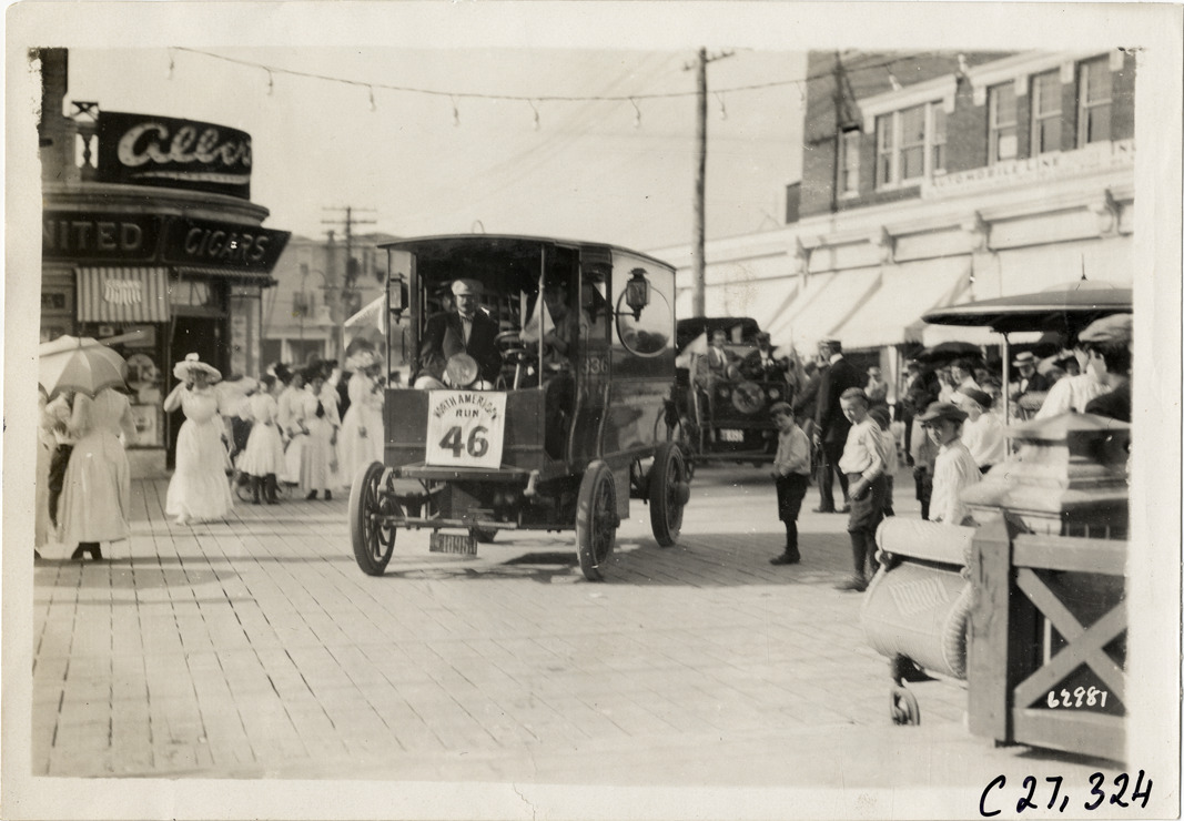 View motorists in truck no. 46 at Young's Pier at Atlantic City, New Jersey during the 1910 North American Run. The reliability contest for commercial vehicles covered a route from Philadelphia to Atlantic City. Stamped on back: "Spooner & Wells, Inc., photographers, telephones 3472-3473 Columbus, 1931 Broadway, New York." Handwritten on back: "Young's truck at Young's Pier, Atlantic City. Tours--North American Run, 1910."