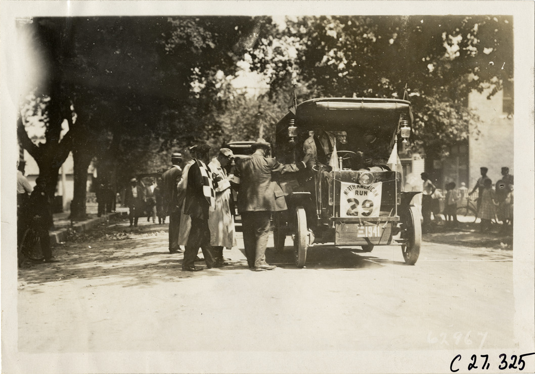 View of motorists in Autocar truck no. 29 at checkpoint in Hammonton, New Jersey during the 1910 North American Run. The reliability contest for commercial vehicles covered a route from Philadelphia to Atlantic City. Stamped on back: "Spooner & Wells, Inc., photographers, telephones 3472-3473 Columbus, 1931 Broadway, New York." Handwritten on back: "Noon stop at Hammonton Autocar truck. Tours--North American Run, 1910."