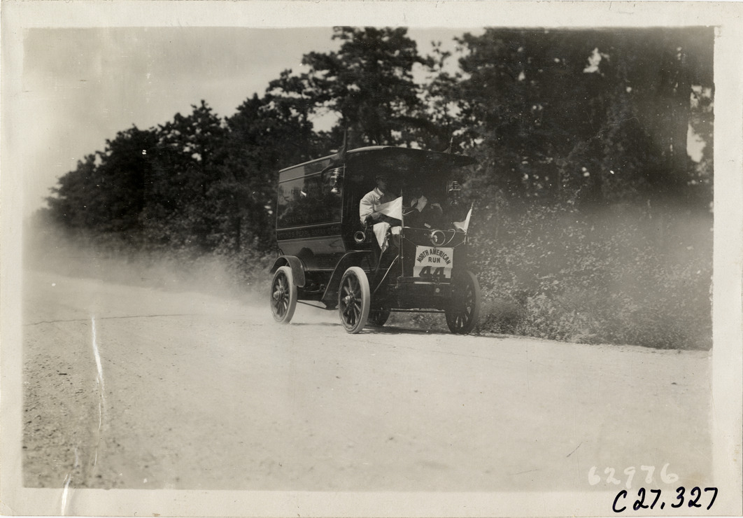 View of motorists in Autocar truck no. 44 traveling on rural dirt road during the 1910 North American Run. The reliability contest for commercial vehicles covered a route from Philadelphia to Atlantic City. Stamped on back: "Spooner & Wells, Inc., photographers, telephones 3472-3473 Columbus, 1931 Broadway, New York." Handwritten on back: "Youngs, Autocar #44 on road to Atlantic City. Tours--North American Run, 1910."
