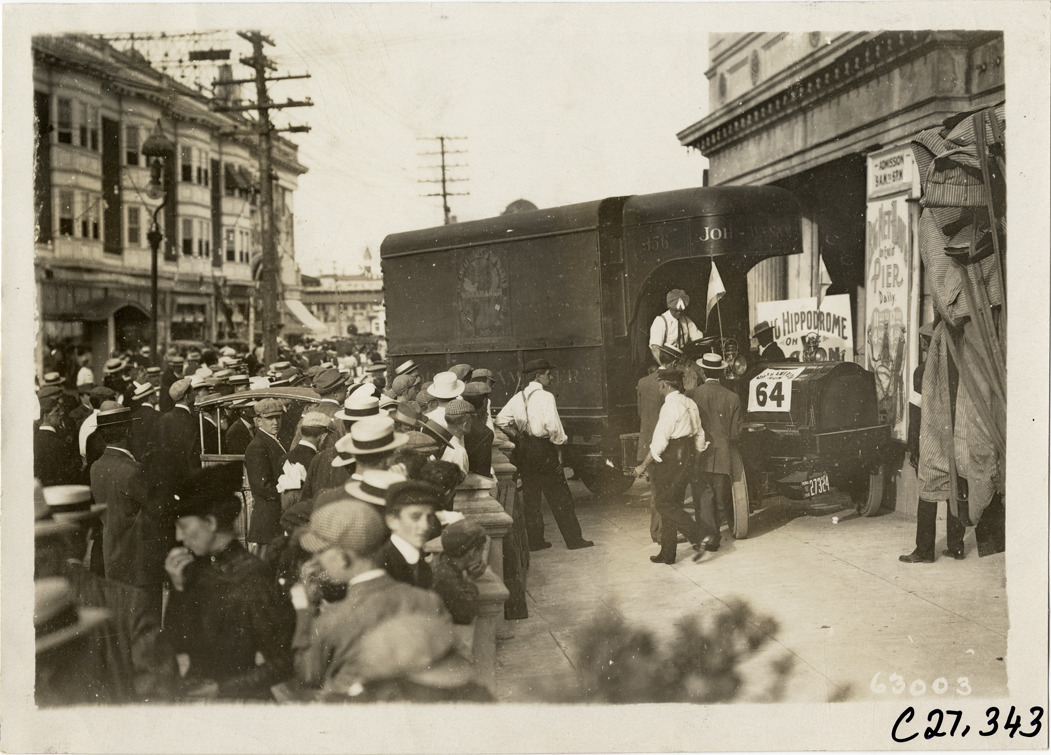 View of Autocar truck no. 64, owned by John Wanamaker, on Young's Pier at Atlantic City, New Jersey during the 1910 North American Run. Crowd of spectators in street. The reliability contest for commercial vehicles covered a route from Philadelphia to Atlantic City. Stamped on back: "Spooner & Wells, Inc., photographers, telephones 3472-3473 Columbus, 1931 Broadway, New York." Handwritten on back: "Tours--North American Run, 1910."