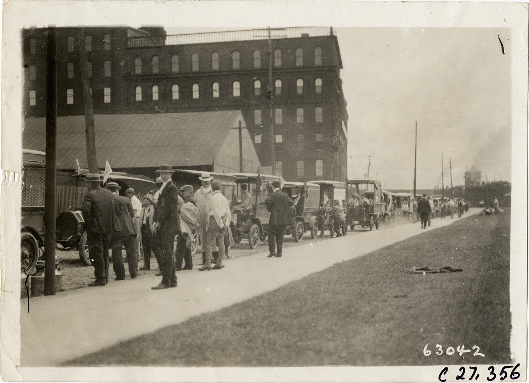 View of motorists with trucks lined up street during the 1910 North American Run. The reliability contest for commercial vehicles covered a route from Philadelphia to Atlantic City. Stamped on back: "Spooner & Wells, Inc., photographers, telephones 3472-3473 Columbus, 1931 Broadway, New York." Handwritten on back: "Tours--North American Run, 1910."