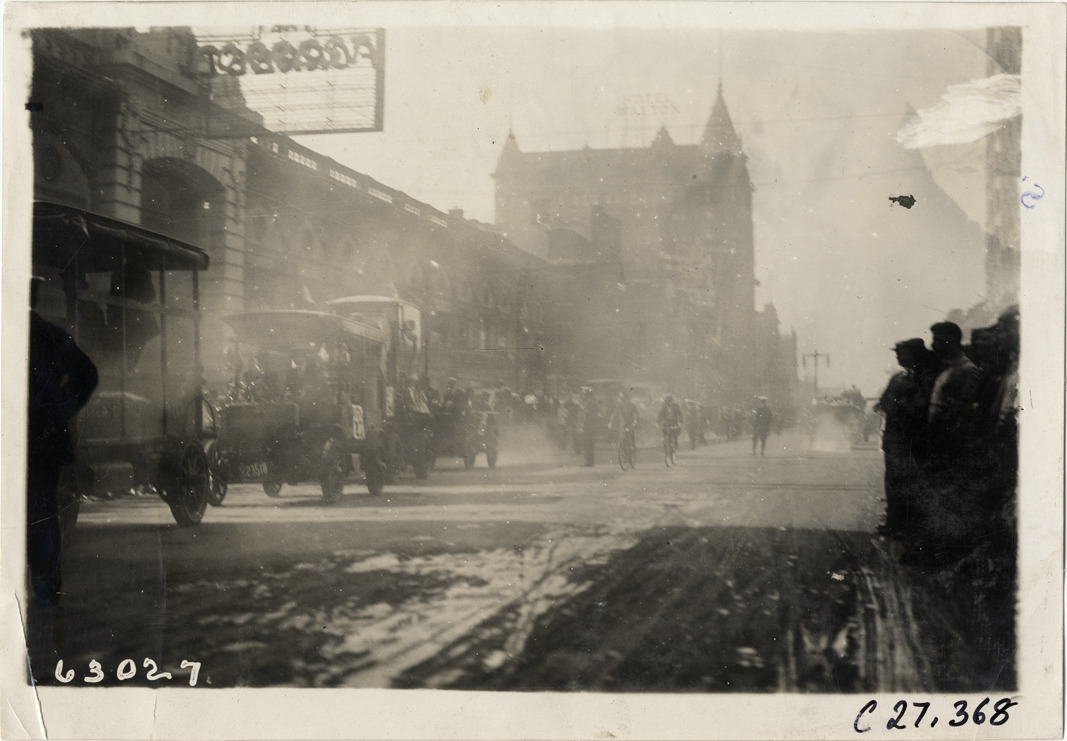 View of trucks in street at Philadelphia, Pennsylvania during the 1910 North American Run. The reliability contest for commercial vehicles covered a route from Philadelphia to Atlantic City. Stamped on back: "Spooner & Wells, Inc., photographers, telephones 3472-3473 Columbus, 1931 Broadway, New York." Handwritten on back: "At Phila. Tours--North American Run, 1910."