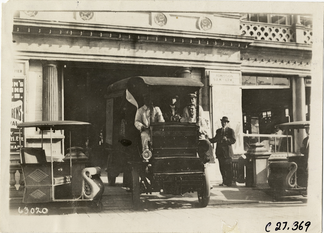 View of motorists in Grabowsky truck on Young's Pier at Atlantic City, New Jersey during the 1910 North American Run. The reliability contest for commercial vehicles covered a route from Philadelphia to Atlantic City. Stamped on back: "Spooner & Wells, Inc., photographers, telephones 3472-3473 Columbus, 1931 Broadway, New York." Handwritten on back: "Grabowsky truck, Youngs Pier, Atlantic City. Tours--North American Run, 1910."