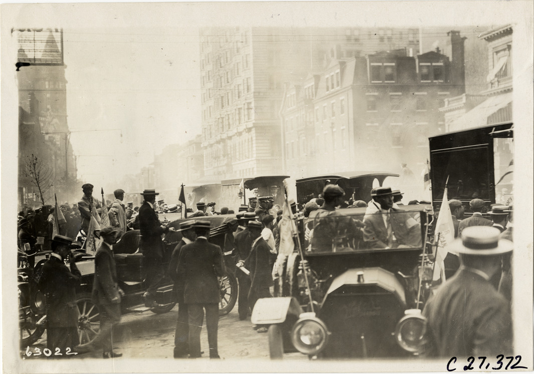 View of motorists with trucks in street during the 1910 North American Run. The reliability contest for commercial vehicles covered a route from Philadelphia to Atlantic City. Stamped on back: "Spooner & Wells, Inc., photographers, telephones 3472-3473 Columbus, 1931 Broadway, New York." Handwritten on back: "General view at start in front of Hotel [undecipherable]. Tours--North American Run, 1910."