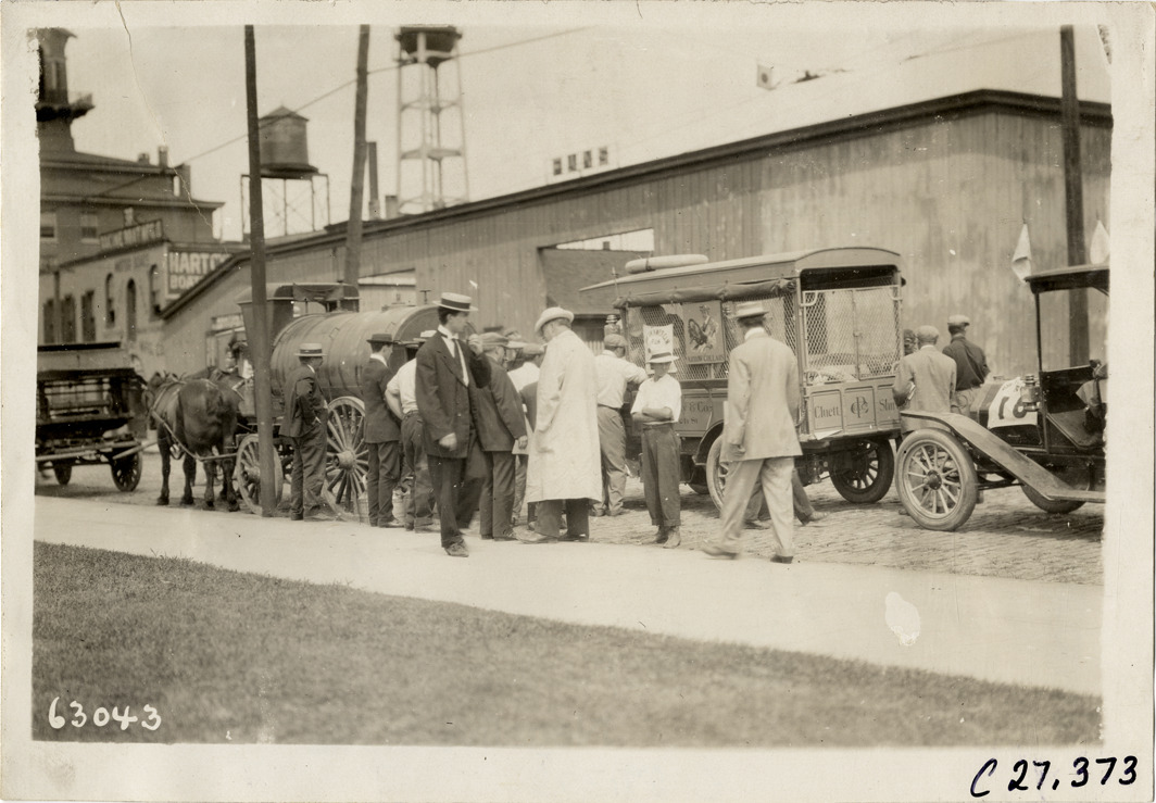 View of trucks and horse-drawn water wagon in street during the 1910 North American Run. Several men stand on sidewalk in foreground. The reliability contest for commercial vehicles covered a route from Philadelphia to Atlantic City. Stamped on back: "Spooner & Wells, Inc., photographers, telephones 3472-3473 Columbus, 1931 Broadway, New York." Handwritten on back: "Tours--North American Run, 1910."