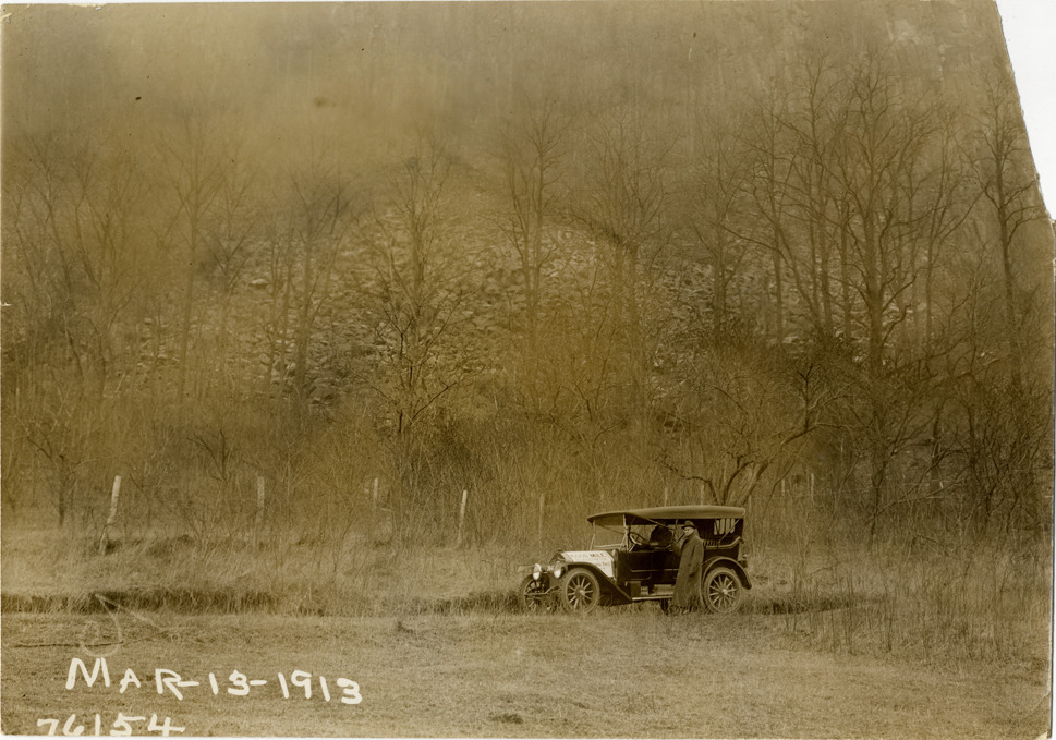 View of motorists in National car traveling on forest road during the 1913 Overman tires 10,000 mile demonstration. The car was outfitted with a set of Overman cushion tires and driven over different routes and road surfaces within a 50 mile radius of New York, New York. Printed on front: "Mar-13-1913." Stamped on back: "Spooner & Wells, Inc., photographers, 1931 Broadway, N.Y. City, phones 3472-3473 Col." Handwritten on back: "Tours--Overman tires 10,000 mile demonstration, 1913."