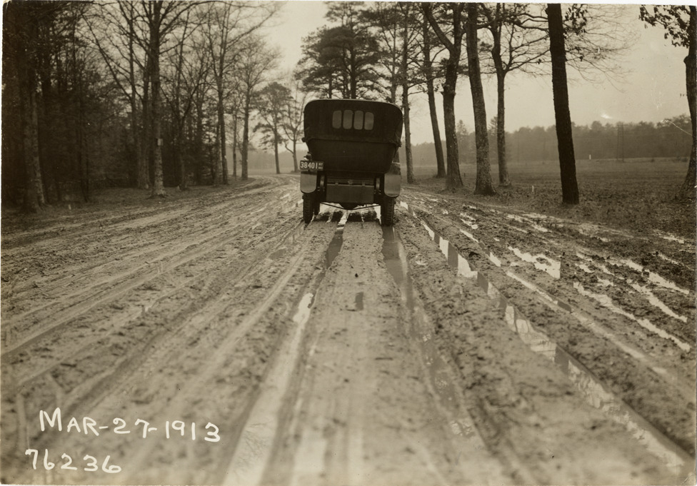Rear view of National car traveling on muddy rural road during the 1913 Overman tires 10,000 mile demonstration. The car was outfitted with a set of Overman cushion tires and driven over different routes and road surfaces within a 50 mile radius of New York, New York. Printed on front: "Mar-27-1913." Stamped on back: "Spooner & Wells, Inc., photographers, 1931 Broadway, N.Y. City, phones 3472-3473 Col." Handwritten on back: "Tours--Overman tires 10,000 mile demonstration, 1913."