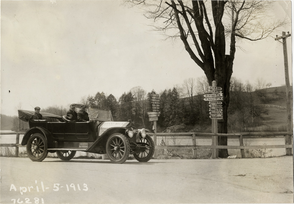 View of motorists in National car stopping at roadside mileage signs during the 1913 Overman tires 10,000 mile demonstration. River or lake in background. The car was outfitted with a set of Overman cushion tires and driven over different routes and road surfaces within a 50 mile radius of New York, New York. Printed on front: "April-5-1913." Stamped on back: "Spooner & Wells, Inc., photographers, 1931 Broadway, N.Y. City, phones 3472-3473 Col." Handwritten on back: "Tours--Overman tires 10,000 mile demonstration, 1913."