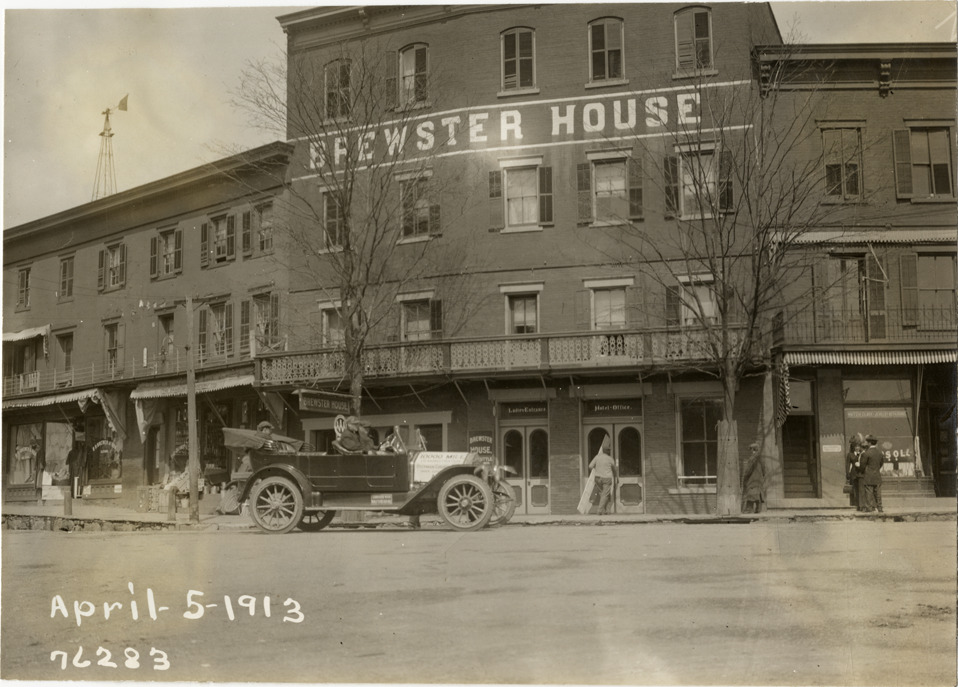 View of motorists in National car in front of Brewster House hotel at Brewster, New York during the 1913 Overman tires 10,000 mile demonstration. The car was outfitted with a set of Overman cushion tires and driven over different routes and road surfaces within a 50 mile radius of New York, New York. Printed on front: "April-5-1913." Handwritten on back: "Tours--Overman tires 10,000 mile demonstration, 1913."