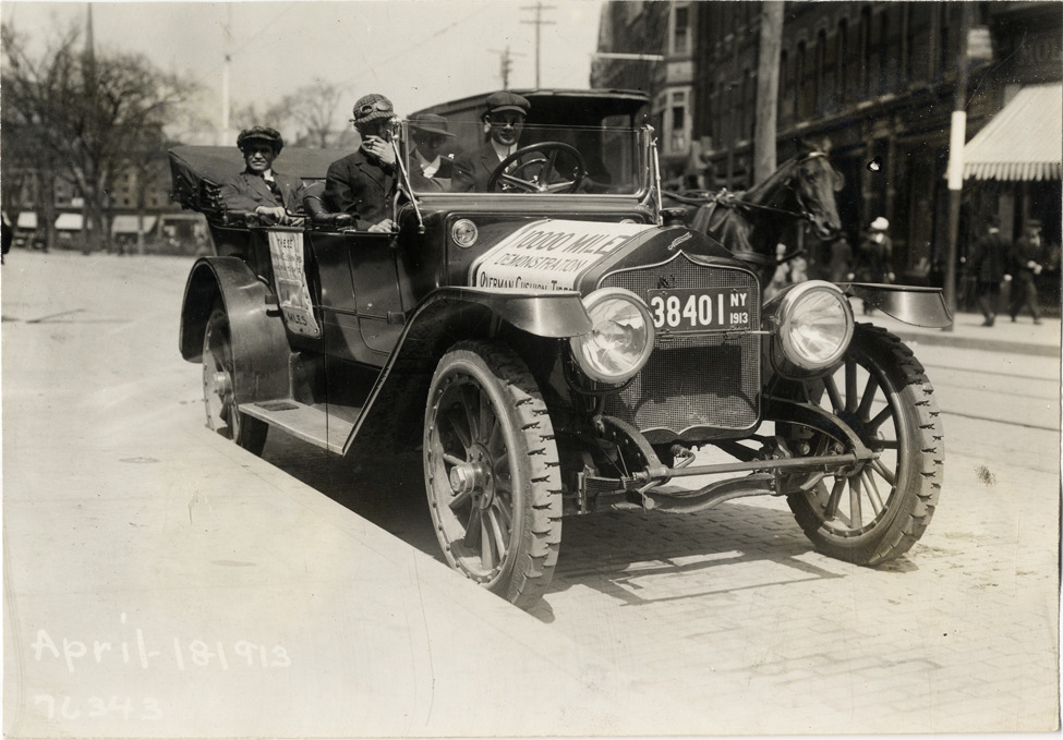 View of motorists posing in National car during the 1913 Overman tires 10,000 mile demonstration. The car was outfitted with a set of Overman cushion tires and driven over different routes and road surfaces within a 50 mile radius of New York, New York. Printed on front: "April-18-1913." Handwritten on back: "Tours--Overman tires 10,000 mile demonstration, 1913."